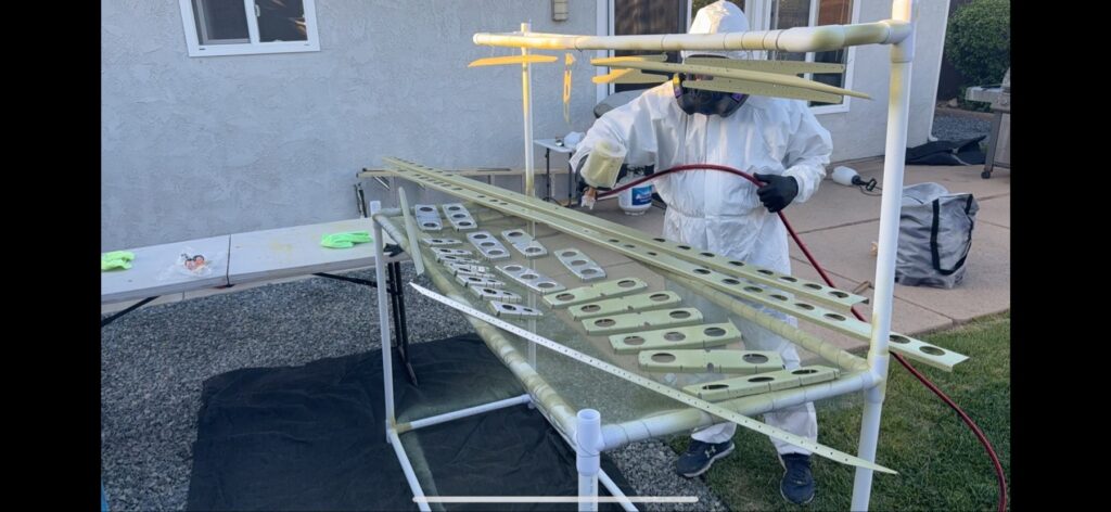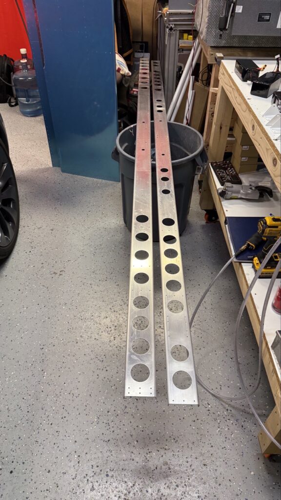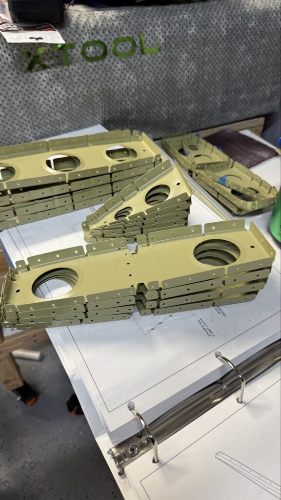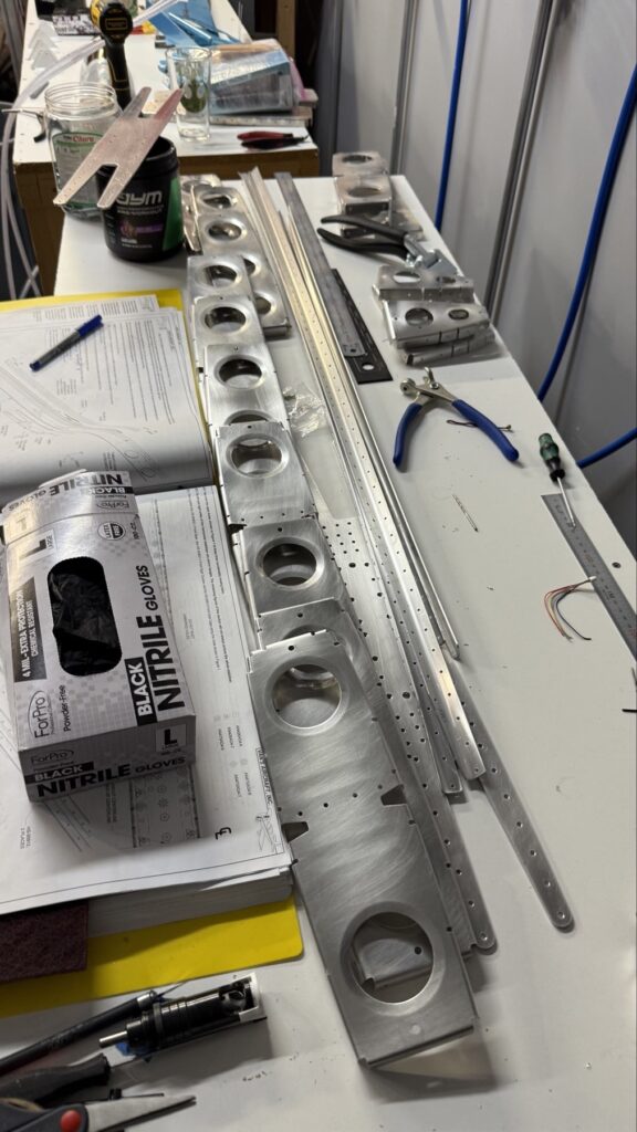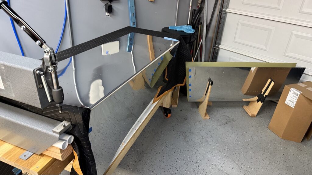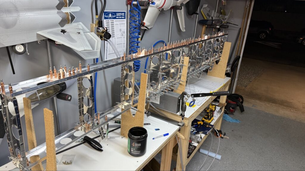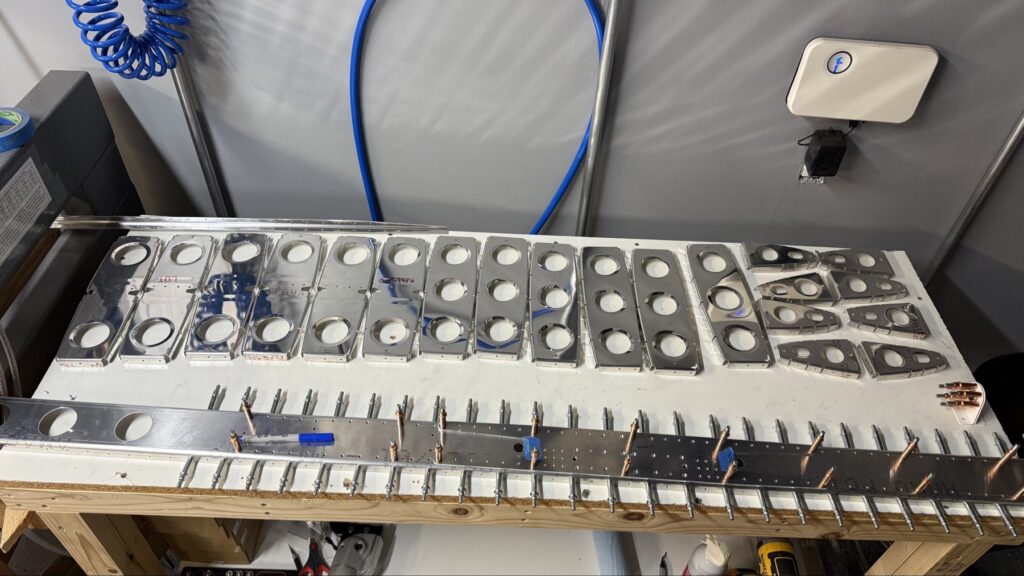 Using the clamps to make sure these pieces are in as tight as they can be prior to match drilling to the sparLabel them here so that after priming (the blue ink shows nicely through the primer) I make sure to get the piece back to their corresponding edgeThis face gets flush riveted to the inside of the spar so I had to countersink this surface of this piece accordinglyAll this countersinking is done with the cutter, in the cage to verify uniform depth as well as the countersink being perpendicular to the face of the pieceAll these ribs have to get attached to the sparI made these cradle pieces to help stand everything up while getting the ribs clecod to the spar. It really starts to show the size nowTest-fitting the skins