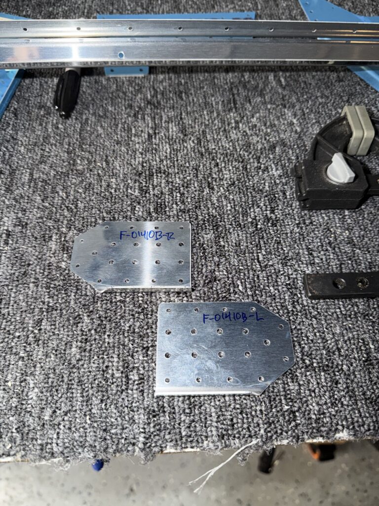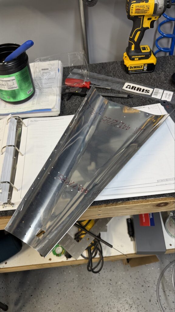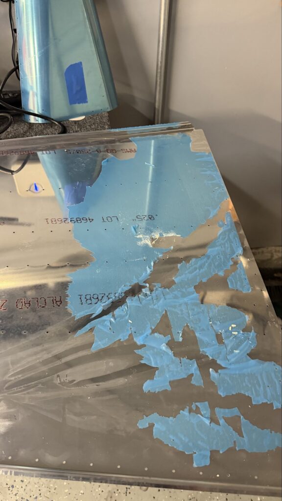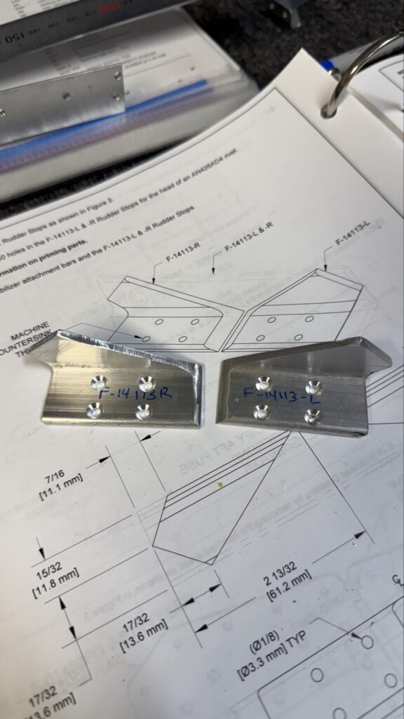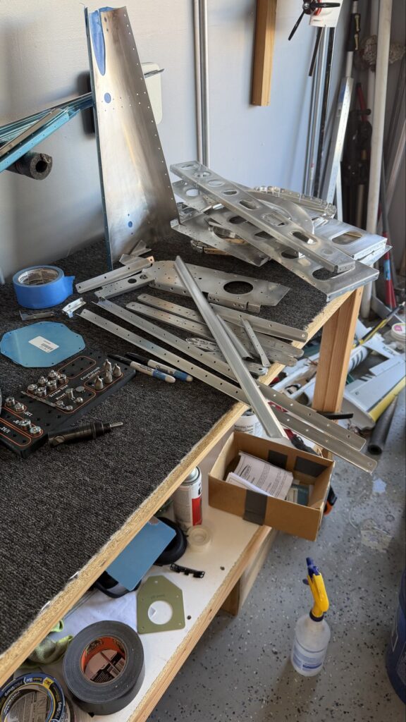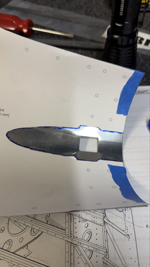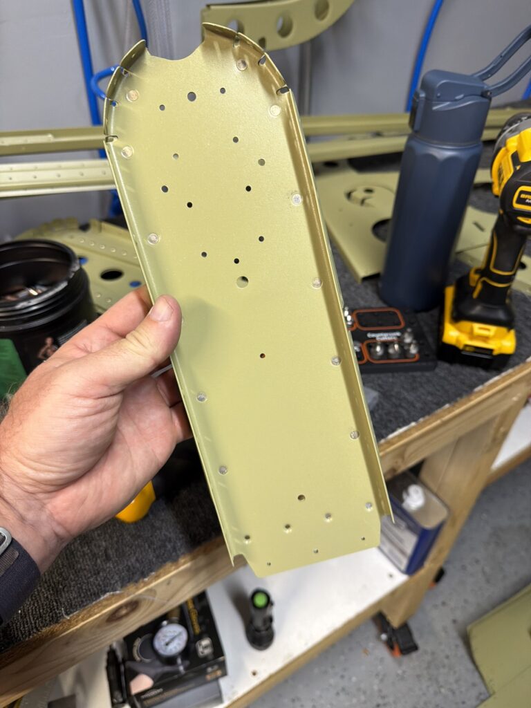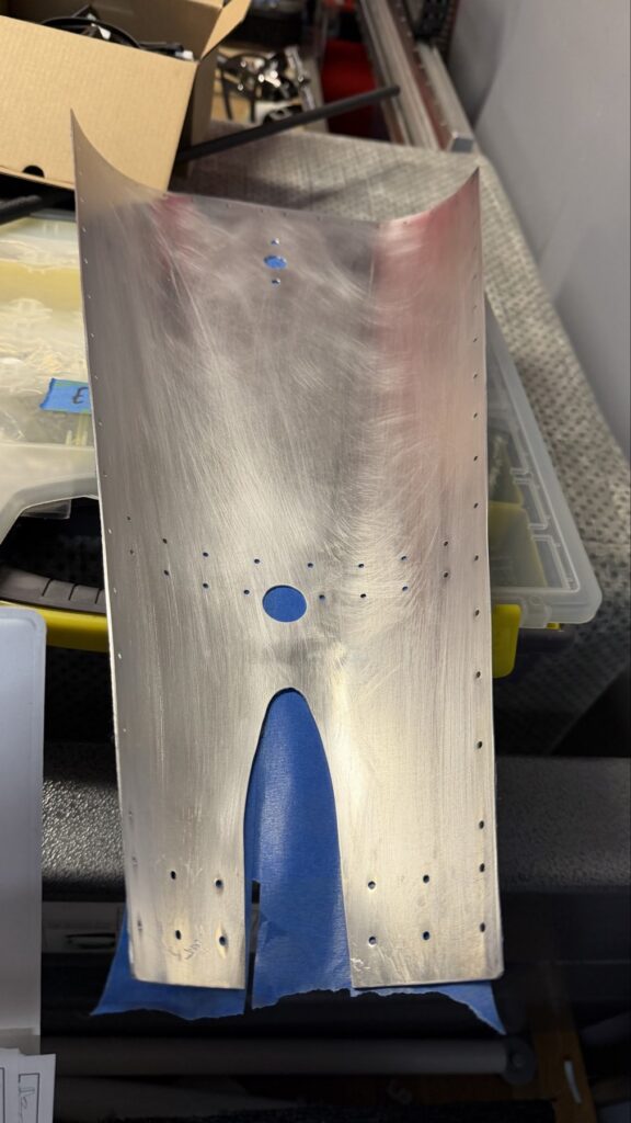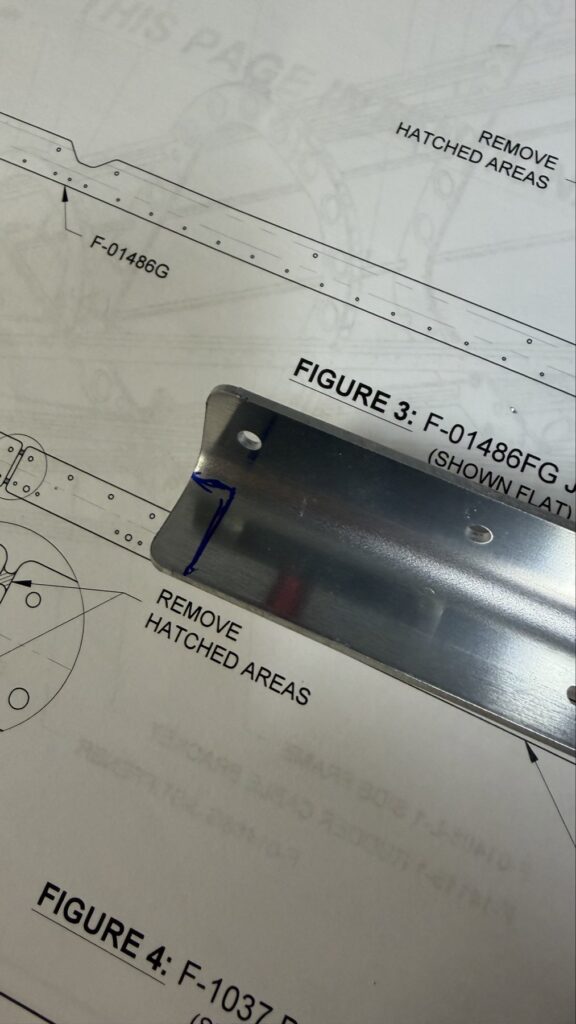 I didn’t say there were no small parts, just fewer..This piece gets shaped from basically just stock angle aluminum to the drawing on the top of the page. I made a couple mistakes here and ended up after a quick email exchange with Vans reproduced this part. Some more small parts..I had to grab the Vertical Stab and match drill some holes in these two pieces, as they join up later in the Empennage Assemble section so you want these to be right nowMore arts and crafts. This was more of that angle stock that I shaped in to what will become rudder stops laterThese are some beefy stiffeners, these have “structural, don’t mess up” written all over them in invisible inkOhhh finally getting to some bigger partsMore arts and crafts with metal shaping on the bandsawThis becomes structure inside where some bellcranks and autopilot servos attach later This part is about to get some tailwheel-based modifications..Taping the stencil in so I know where to remove materialTracing the stencil on to the aluminumWith that material removed, I do a test fit with the tailwheel holder thingy and the other components all right here. Additional shaping was required for the desired fit but I did get it there..This is what it looks like from the inside..and the back. The Tailwheel assembly will slide in to this piece way later in the process, but it’s cool that it’s there nowWith that shaping done, in to Primer Prep we go! You can see what my final shape ended up as, vs the template above.All these oddly shaped channel stiffeners need to get prepped as wellThese two long pieces are longerons; they’re heavier aluminum than all the other stiffeners that run lengthwise in the aft fuselage and provide a lot of support in the aft fuselage in general. They look bent in the picture, that’s because they are.. they help define the shape of the tail as it decreases in size. The precision of these kit parts and how they all line up together is very impressive.This blue vinyl film really should not be exposed to sunlight. This piece was under a small window in my shed for a little less than a year and it took a lot of work to get it removed since the glue changed itself up and decided it never wanted to let go.Little by litter, I eventually got it all removed