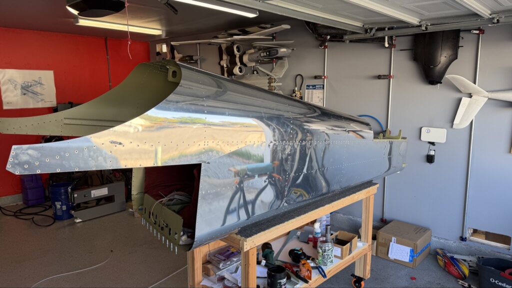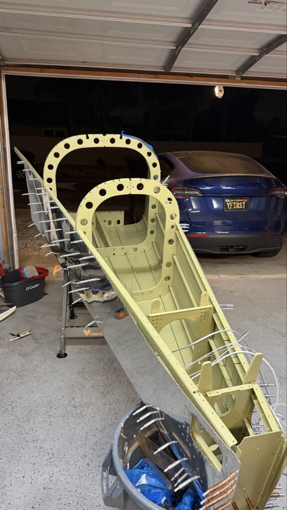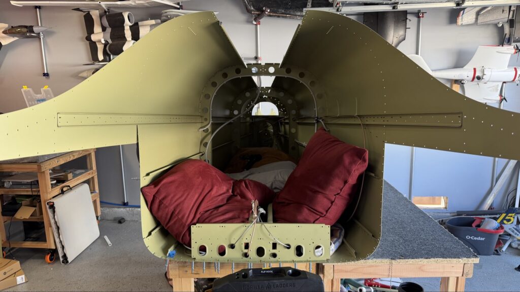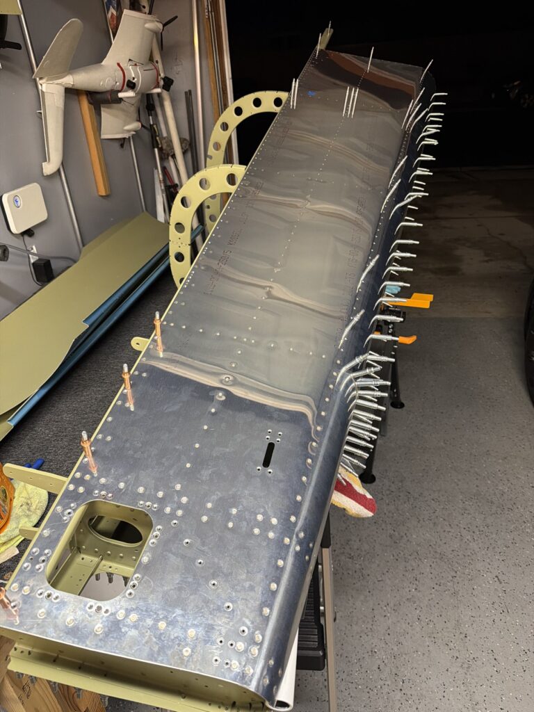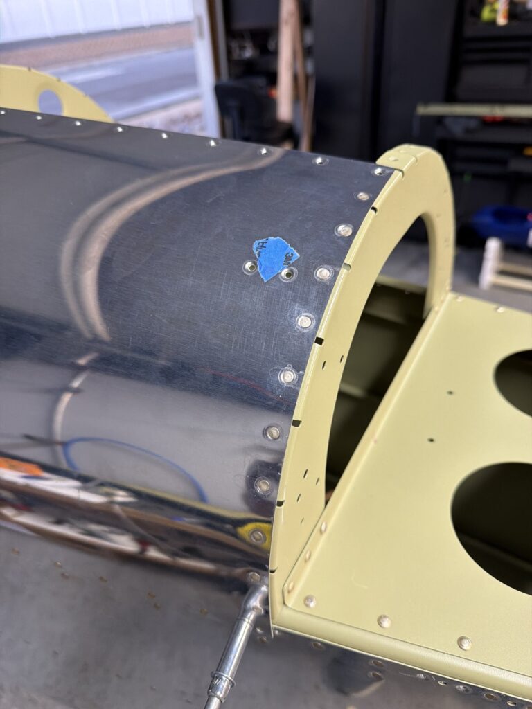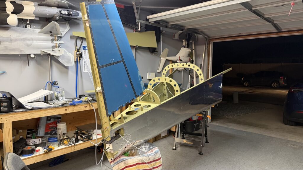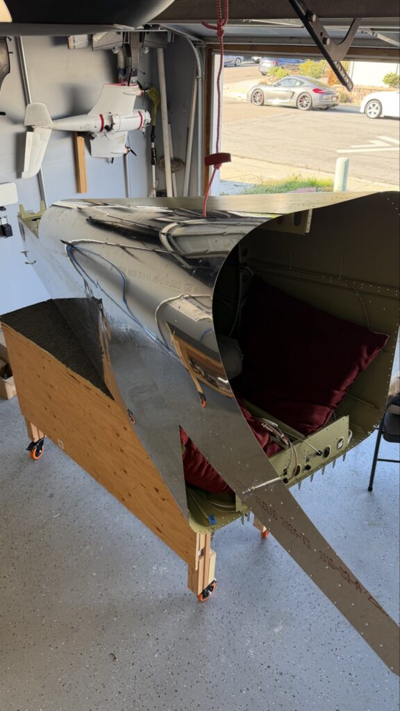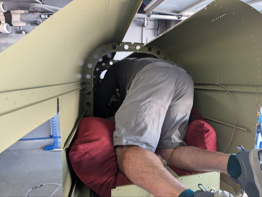 A really special friend came to visit me and some of our other friends here in San Diego, so of course I had to put him to work. Need to fill out that build log with as many friends as I can manage!Starting to get an idea of what things look like hereI turned that assembly over and attached the first two side skinsGetting the tailwheel holder attached so I can cover it up with that heftier skinHere is the skin clecod on. Don’t worry about those “spots” there, I wasn’t priming the outside of this part but I did break the alclad coating as a part of this metal shaping, so I deburred all of that and then went over it with an Alodine pen to protect it.Actually starting to run some systems wires, even an antenna cable!So many clecosThings getting permanent over here!This is one of the two rudder cables. These are guided out by these nylon parts that get riveted to the skinI am enlarging these holes to accept the static ports for the pitot-static systemThe Vertical got temp attached for some additional holes that needed to be matched upThis is the top skin that gets a rib and a doubler attached to it. This part is another of my priming mistakes.. I accidentally primed both the inside and the outside, foolishly thinking this part was just an internal doubler when in fact it was a visible skin.Speaking of oopsies, this access plate also got primer on both sidesHung one of the top-side skins and got the second one dimpled and also ready to hang, but it doesn’t go up until this part gets riveted down.Thanks to Jeff, I was able to finish these top skins and call it done!I had to get comfy though..Yeah.. here’s that top skin that shouldn’t have been primed on both sides. I don’t want to talk about it.