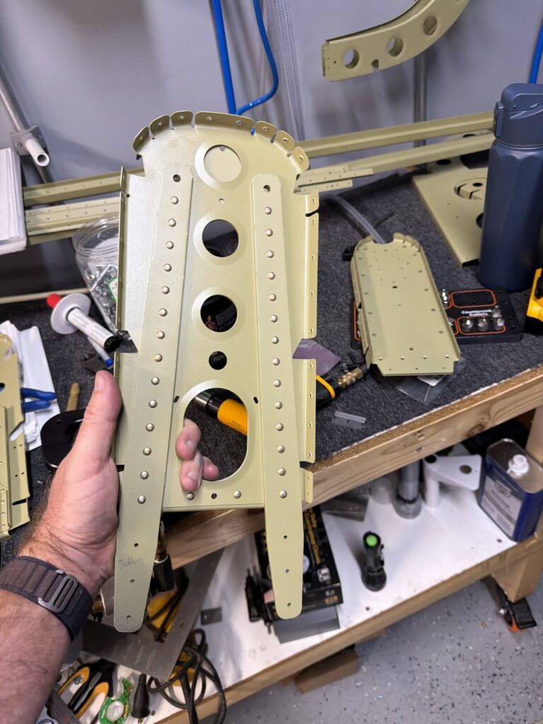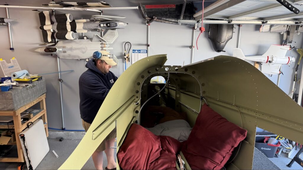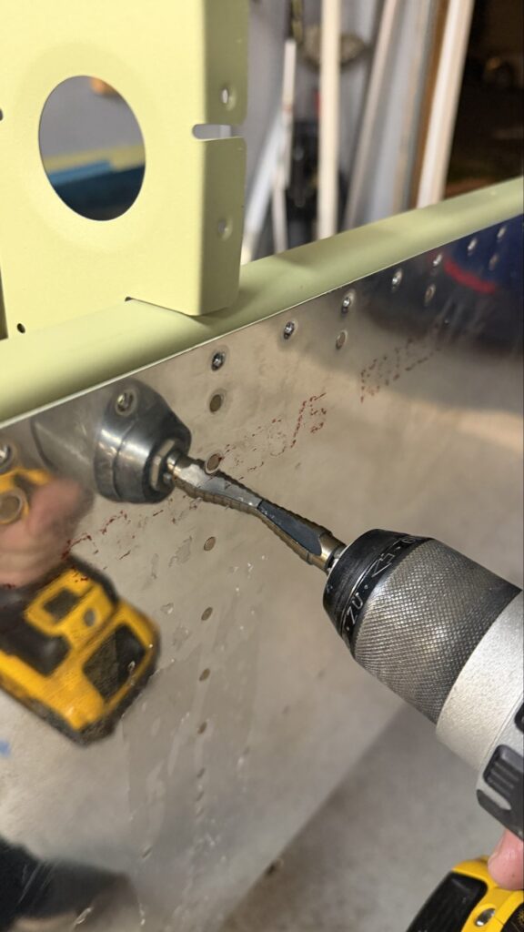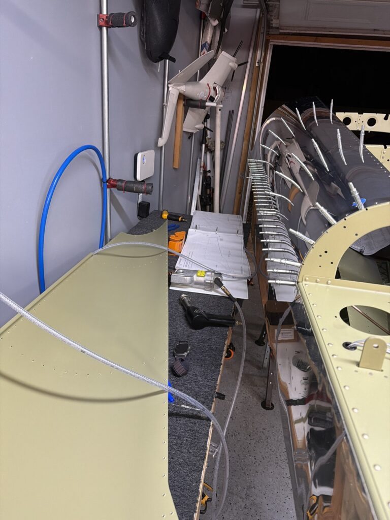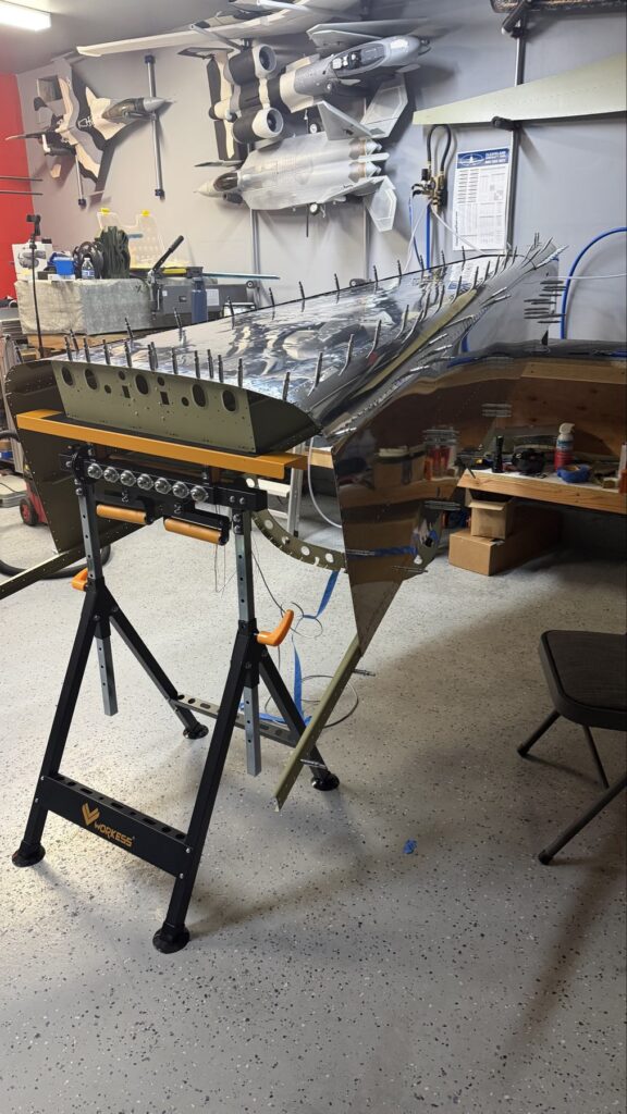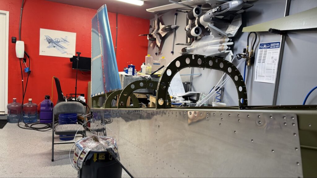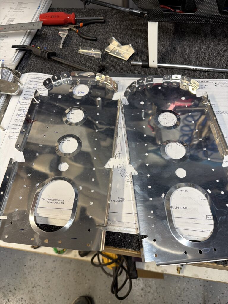 A really special friend came to visit me and some of our other friends here in San Diego, so of course I had to put him to work. Need to fill out that build log with as many friends as I can manage!Starting to get an idea of what things look like hereI turned that assembly over and attached the first two side skinsGetting the tailwheel holder attached so I can cover it up with that heftier skinHere is the skin clecod on. Don’t worry about those “spots” there, I wasn’t priming the outside of this part but I did break the alclad coating as a part of this metal shaping, so I deburred all of that and then went over it with an Alodine pen to protect it.Actually starting to run some systems wires, even an antenna cable!So many clecosThings getting permanent over here!This is one of the two rudder cables. These are guided out by these nylon parts that get riveted to the skinI am enlarging these holes to accept the static ports for the pitot-static systemThe Vertical got temp attached for some additional holes that needed to be matched upThis is the top skin that gets a rib and a doubler attached to it. This part is another of my priming mistakes.. I accidentally primed both the inside and the outside, foolishly thinking this part was just an internal doubler when in fact it was a visible skin.Speaking of oopsies, this access plate also got primer on both sidesHung one of the top-side skins and got the second one dimpled and also ready to hang, but it doesn’t go up until this part gets riveted down.Thanks to Jeff, I was able to finish these top skins and call it done!I had to get comfy though..Yeah.. here’s that top skin that shouldn’t have been primed on both sides. I don’t want to talk about it.